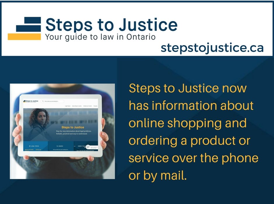 Steps to Justice now has information about online shopping and ordering a product or service over the phone or by mail. Find out more at: http://stepstojustice.ca/category/legal-topic/consumer-law/buying-goods-and-services